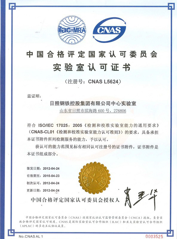 2020Rizhao Steel central laboratory received accredited certificate, it not only marks the company reached the international advanced level in terms of technical level and management of products and raw materials quality test, but also marks the company's quality inspection process is in line with international practice, inspection reports gain international recognition, can provide authority testing services for the company's quality supervision and inspection.